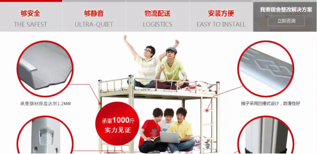 無論是目标客戶是學(xué)校,企業,政府單位,宿舍床基本訴求就(jiù)是——“安全”連盈把其放在第一個位置,讓客戶放心購買!