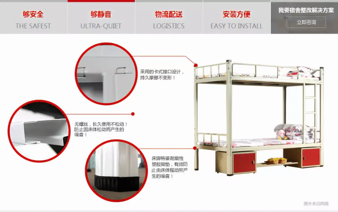 在基本需求後(hòu),連盈家具把其鐵架床“夠靜音”與同行差異化出來,“3分鍾能(néng)快速安裝好(hǎo)的宿舍床”等“安裝方便”的特點;與同行或者同類産品相比,更是獨勝一籌,連盈宿舍床産品競争力一下突顯出來!